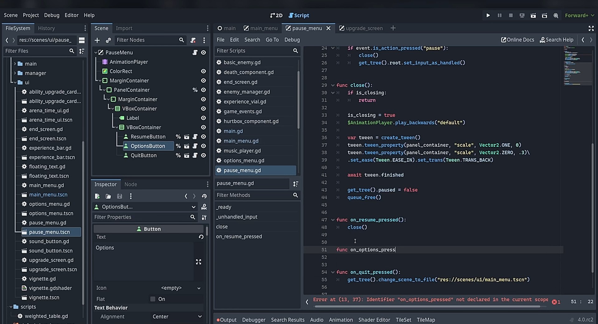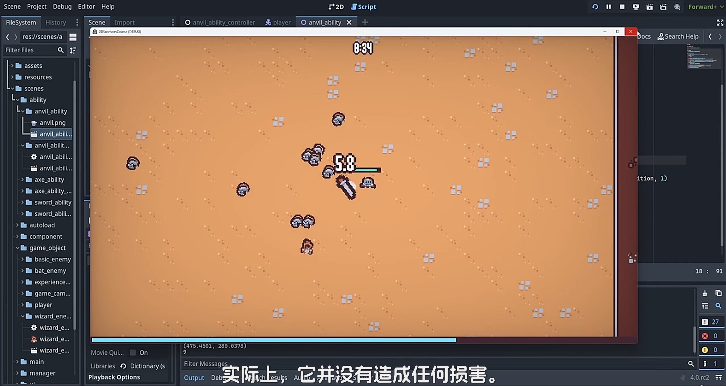 随着课程的推进,重点转向了游戏系统的深度构建与功能实现。学员将学习如何设计并编码多种独特的攻击技能(如剑术、斧头、铁砧等),并通过精心设计的升级池系统,让玩家在每次游戏过程中都能获得个性化的成长路径。课程详细讲解了如何利用Godot的动画系统为玩家、敌人(包括普通老鼠和强大的巫师)以及拾取物(如经验瓶)赋予生动的视觉反馈,并通过伤害浮动文本、受击闪光等细节大幅提升“游戏感”。同时,一个完整的用户界面(UI)系统也将被逐步建立,涵盖生命值与经验条、胜利/失败结算画面、暂停菜单以及功能强大的主菜单,确保游戏体验的专业与完整。