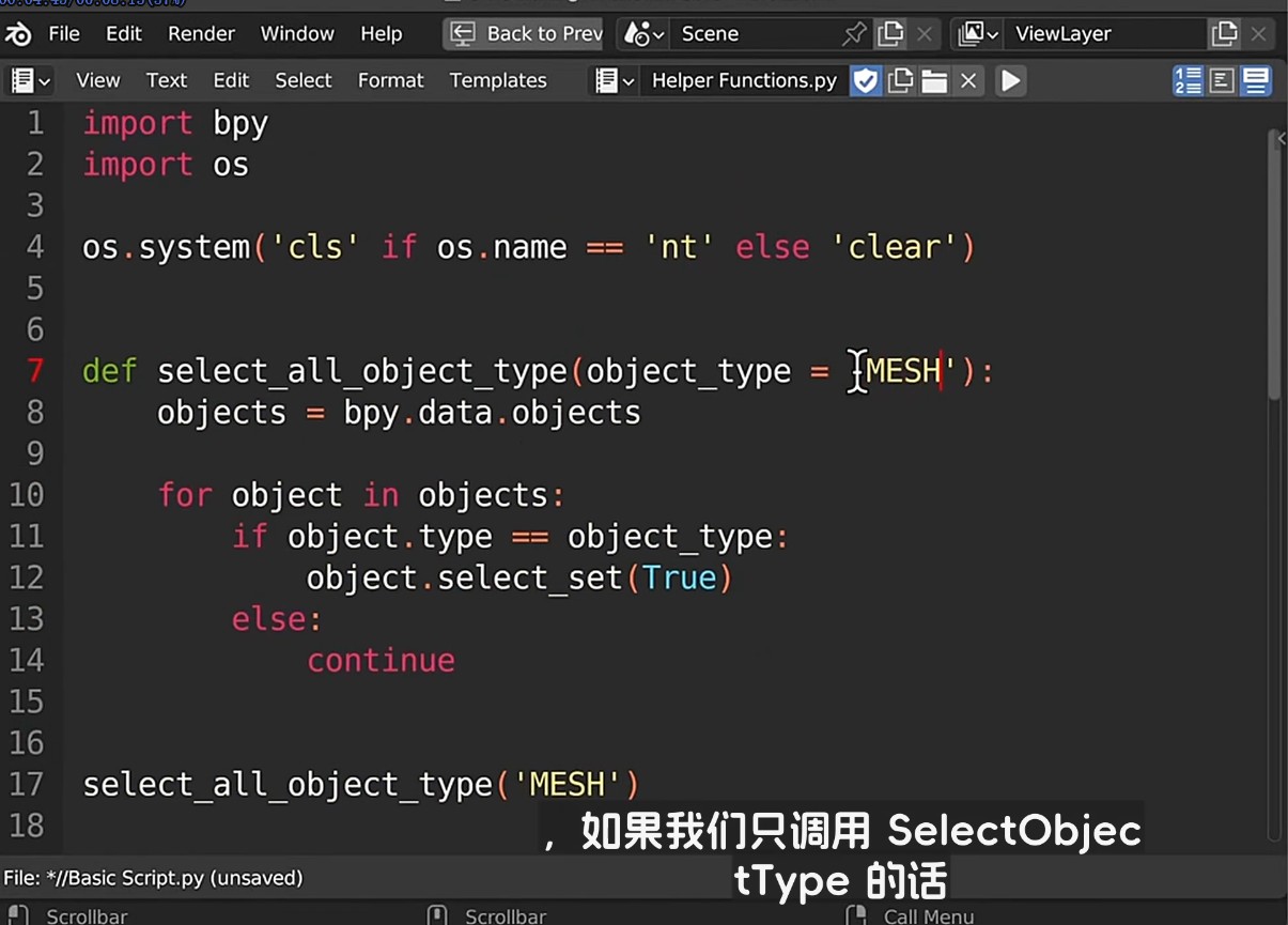 课程循序渐进地引入Python核心编程概念,包括变量、数据类型、注释、循环、条件语句、函数定义与调用等,并紧密结合Blender场景进行演示。例如,通过索引或名称选择对象、激活特定物体、清理选择状态等操作,让抽象的代码立刻转化为可视化的3D编辑行为。同时,课程强调良好的编码习惯,如避免“魔法数字”、合理命名函数、编写文档字符串以及正确处理缩进(空格 vs 制表符),培养学员的专业素养。