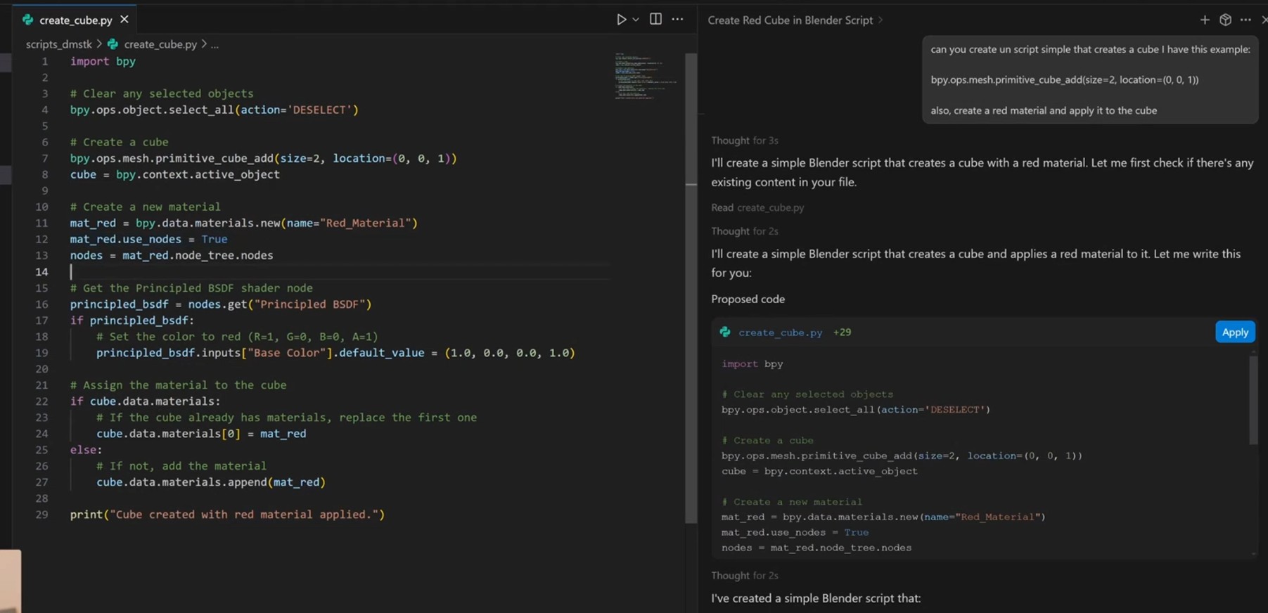 课程深入整合了名为“Windsurf”的AI辅助开发工具,帮助你在Blender环境中直接编写、调试和管理Python脚本。你将学习如何在Blender文本编辑器中加载外部脚本、启用实时修改、组织模块化代码库,并通过系统控制台查看输出结果。此外,课程还展示了多个实用案例,如自动生成带材质的立方体、将选中边转换为平滑曲线、自动切换相机纵横比以适配横竖屏渲染等,切实解决日常3D工作流中的重复性任务。