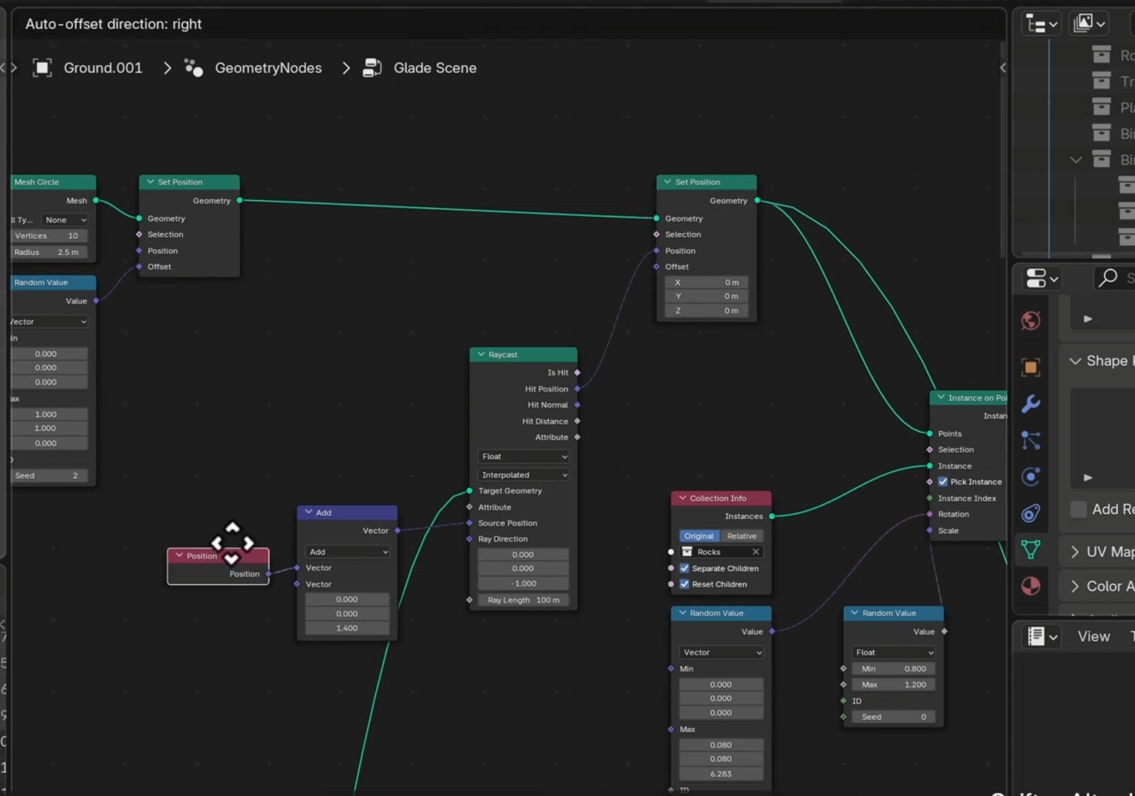 随着课程推进,内容逐步拓展至动态效果与交互式场景构建。学员将学习如何模拟风对植物的影响——通过动画噪波驱动旋转与摆动,实现自然律动;如何沿样条线循环移动物体,打造飞行鸟群的错觉;以及如何结合射线投射、几何接近和属性统计等高级节点,实现基于相机距离缩放岩石、根据邻近物体调整草高、自动对齐广告牌朝向摄像机等智能行为。这些案例不仅展示了几何节点的技术深度,也凸显其在构图与视觉叙事中的实用价值。